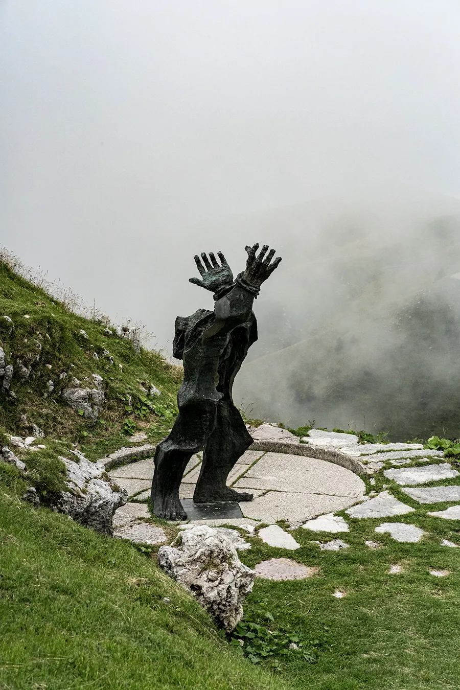 Situato sul luogo ove sette partigiani furono barbaramente trucidati dalle truppe nazifasciste, il monumento, realizzato nel 1974, intende ricordare per l’appunto l’intensa attività partigiana che durante la Resistenza ebbe come teatro i pendii del Monte Grappa. Situato a breve distanza dal monumentale Sacrario di Giovanni Greppi che commemora i caduti italiani e austroungarici della Prima Guerra Mondiale, il monumento se ne distacca anzitutto per dimensioni e quindi per concezione architettonica. Esso fu concepito da Davanzo, con la collaborazione dello scultore Augusto Murer e del poeta Andrea Zanzotto, Dalla Strada Statale 149 si diparte un sentiero che conduce subito a una passerella in cemento dall’andamento segmentato che scende, per mezzo di alcuni gradini, su una piattaforma. Lungo questo percorso di avvicinamento, delimitato dal pendio di terra e sassi a monte, e da un muretto in conglomerato cementizio a valle, sono posizionate lapidi in cemento in cui sono riportati in caratteri bronzei versi di Quasimodo, Ungaretti e dello stesso Zanzotto. Di particolare suggestione è la scultura, dalle dimensioni monumentali, soprattutto per il visitatore che è costretto a girarci attorno sulla piccola piattaforma. D’inverno, quando la neve ricopre le strutture architettoniche, spicca ancora più suggestiva al di sopra del manto bianco.