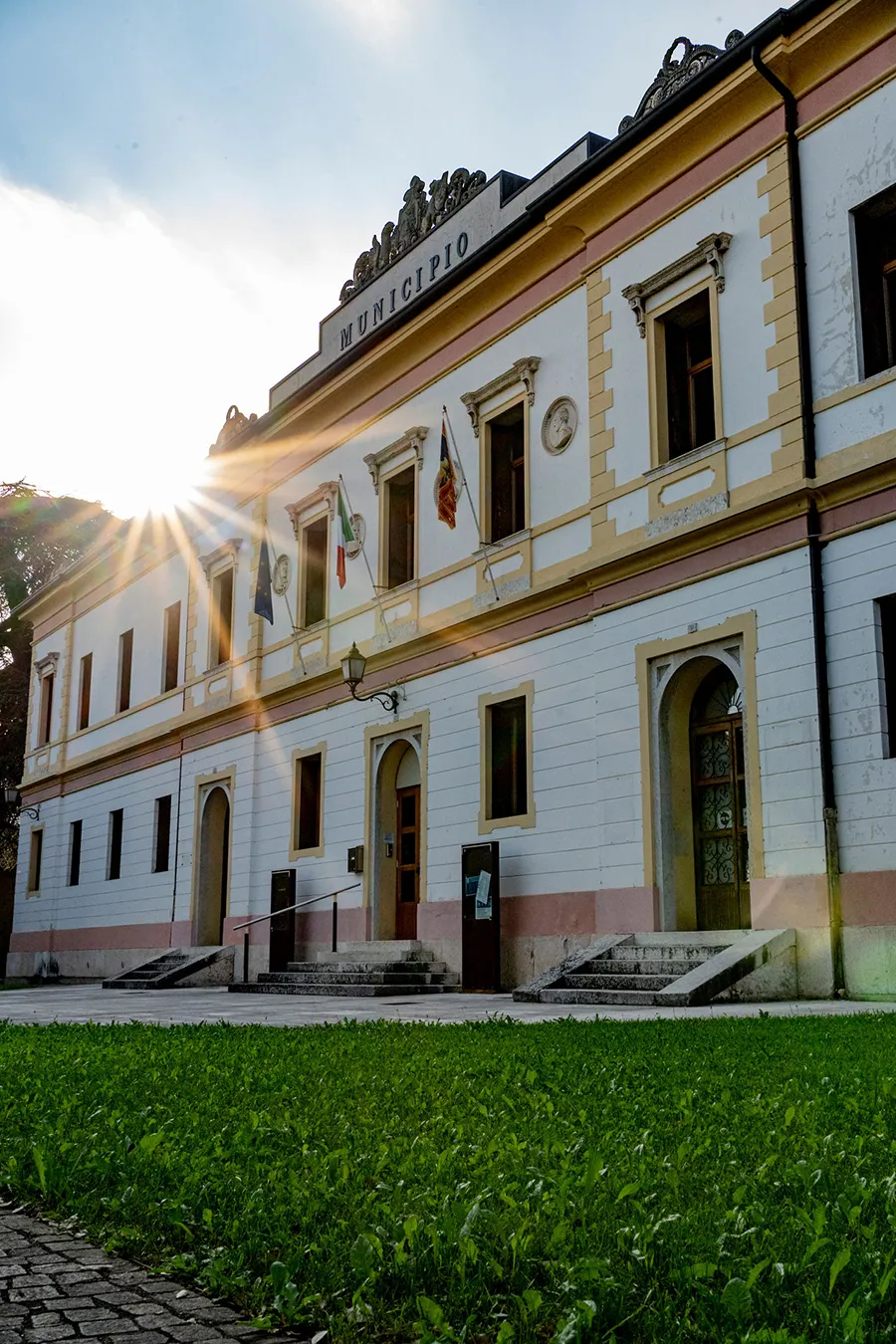 Il palazzo del Comune viene costruito sul finire del XIX secolo con la funzione di ospitare le scuole maschili di disegno, il municipio e una sala teatrale. Nel 1875, su progetto dell’ing. Antonio Zardo, viene sviluppata l’idea di un triplice concetto in un solo corpo di fabbrica all’insegna di un’architettura non particolarmente ambiziosa, ma funzionale. La parte ad est, destinata ad accogliere gli uffici comunali, avrebbe ospitato al piano terra la segreteria e l’archivio, al piano primo l’ufficio del sindaco e quello anagrafico. La parte ad ovest ospita la scuola dopo che, con il rivitalizzarsi delle finanze grazie al Lascito Sartori Canova, vengono destinati dei fondi all’istruzione: nei decenni di fine secolo si vede l’istituzione di scuole di disegno, agraria, tessitura e tagliapietre. La parte centrale, più importante anche visivamente sul fondo prospettico dell’edificio, doveva essere un atrio spazioso attraverso il quale accedere alla contigua sala teatrale; al di sopra un ampio salone ad uso promiscuo ospita le scuole e il municipio. Secondo la descrizione la sala teatrale avrebbe avuto dimensioni di 10 metri e mezzo di larghezza e metri 18 di profondità, con un ampio pal- coscenico ad ingresso separato e otto camerini. Alle logge poste in alto si sarebbe avuto accesso dalle scale del municipio stesso. La lunga facciata a tredici fori è scandita verticalmente dal movimento in rilievo delle superfici, lasciando maggiore autorità alla parte centrale con le scalinate e gli ingressi al piano terra; la lunga e regolare fila di finestre al piano primo, sormontate alcune da leggere cornici, contiene quattro medaglioni in rilievo, raffiguranti Dante, Canova, Alfieri e Metastasio. Il frontone soprastante, rettangolare e con il fregio, lo stemma di Crespano e alcune figure allegoriche, si riallaccia idealmente a quello del Caffè Canova, primitivo e anch’esso irrealizzato progetto di teatro comunale.