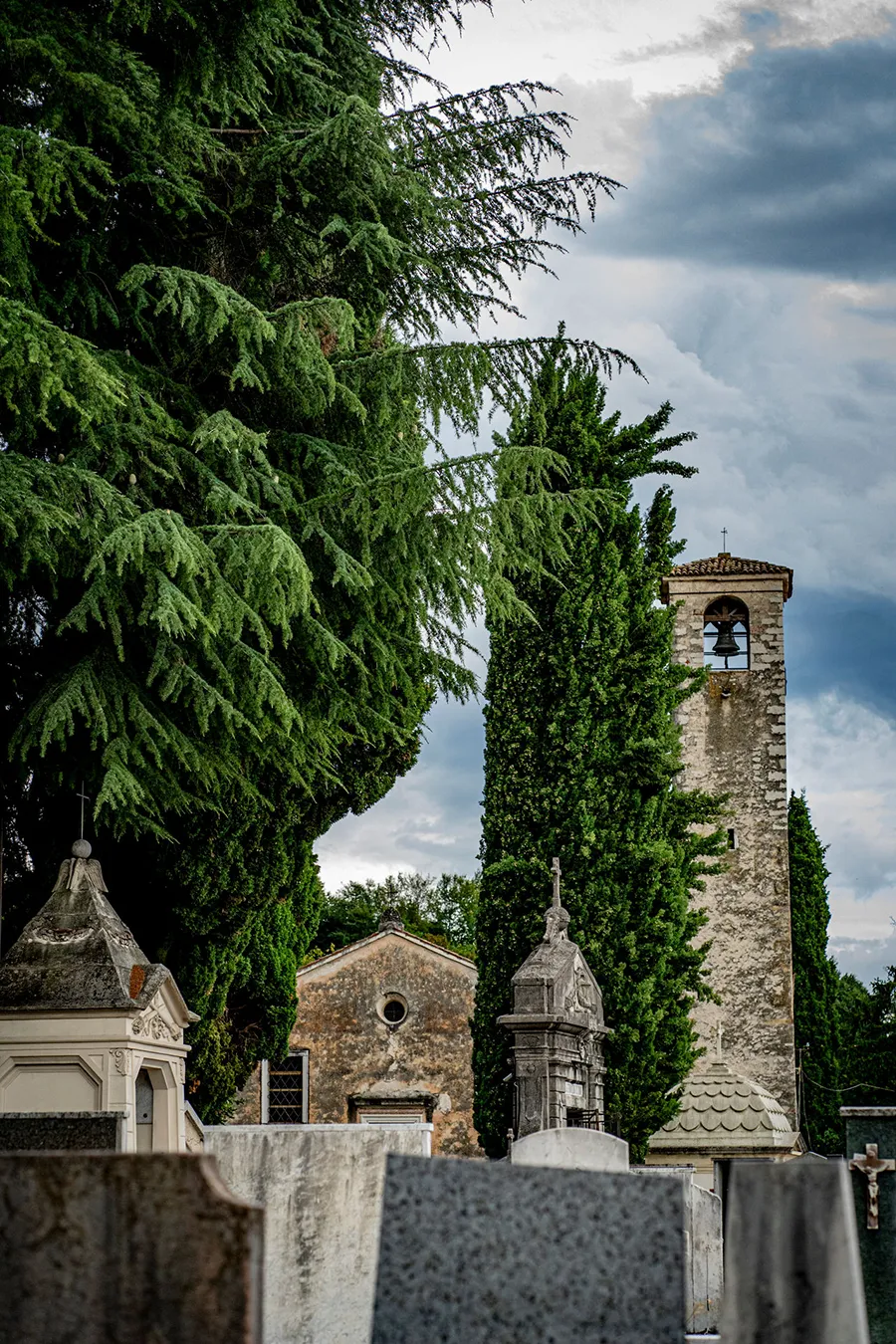 Dagli atti della visita pastorale del settembre 1488 veniamo a conoscenza che la chiesa era provvista di tre altari dei quali uno non consacrato e uno da demolire; nel successivo Cinquecento la chiesa di San Marco è restaurata ed ampliata, mettendo in secondo piano San Pancrazio che, comunque, si distingue per la canonica e il cimitero. Nella visita pastorale del 1633 si ricorda il vecchio altare maggiore in legno; la pala raffigurava la Vergine con ai lati i santi Marco e Pancrazio. Giambattista Verci (1775) ricordava invece una pala di Jacopo da Ponte raffigurante la Vergine, Gesù Bambino, san Rocco e san Sebastiano. Così anche monsignor Federici (1803): “In Crespano nell’antica Parrocchiale di S.Pancrazio la Palla a mano destra della maggiore con la B.V. tenente il Bambino con angioletti, S.Rocco e S.Sebastiano é parimenti di Giacomo” Il terremoto di Santa Costanza (25 febbraio 1695) non causò gravi danni a Crespano ma mise in evidenza la necessità di restaurare tutti gli edifici sacri del paese. Il parroco dell’epoca, il crespanese don Valeriano Manfrotto, si prodigò per il restauro delle chiese colpite dalla calamità e per consolidare le coltivazioni di viti e di alberi da frutto. Attorno al 1840 si rese necessario l’ampliamento della zona cimiteriale perché l’area attorno alla vecchia parrocchiale di San Marco era inagibile. I lavori vennero affidato all’ingegner Ausilio Manera (1787-1870), figlio di un cugino dello scultore Antonio Canova che demolì la vecchia canonica e progettò un’ampia cinta muraria. La lapide più antica che oggi si conserva è quella del chierico Giovanni Colombana, chierico nel seminario di Padova, morto a soli 20 anni nell’agosto 1855; il testo dell’epigrafe venne dettato dal suo compagno di studi, Giuseppe Sarto, futuro papa Pio X. Nell’ottocentesca area cimiteriale è possibile notare la tomba-monumento equestre della famiglia Rossi, che con Giovanni (1830-1882) e il figlio Giuseppe, sommo auriga (1852-1910), è protagonista del mondo del trotto europeo; il busto di Giuseppe ricopre la tomba dominando il bassorilievo in cui è trasfigurata la storia dell’ippica dall’origine al loro tempo.